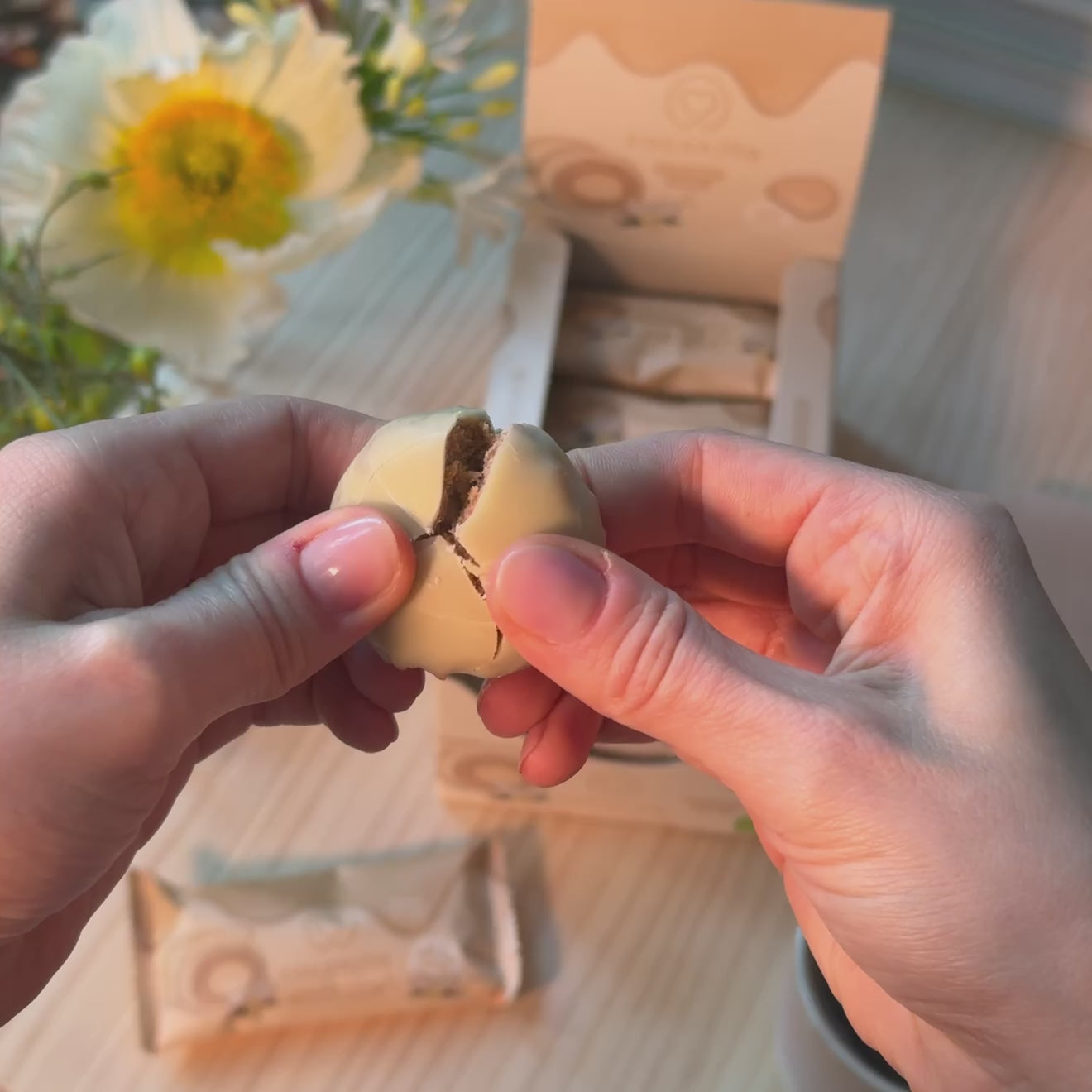 Für alle Kokosliebhaberinnen haben wir die Sorte Coconut Choc entwickelt. Die cremige Kokosfüllung besticht durch ihren zarten Kokos-Mandelgeschmack mit Vanillenote. Sie ist eingebettet in einem Mantel aus Mandelmus, Kakaobutter, Datteln und Hafer & umzogen von einer weißen, schokoladenartigen Schicht.
